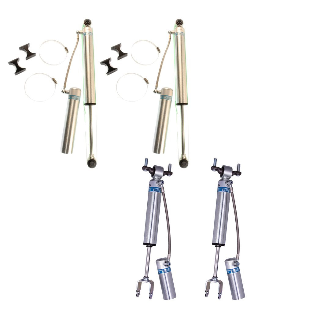 Bilstein B8 5160 remote reservoir shock absorbers are designed as a direct fit solution for lifted trucks and SUV’s. The remote reservoir will offer increased cooling capacity and wheel travel to optimize overall performance compared to a traditional shock absorber. These shock absorbers feature a monotube design for consistent fade free performance and utilize velocity sensitive digressive valve settings which are tuned for each specific application. Each shock absorber is fitted with a unique 360 degree swivel banjo hose fitting, providing a clean, low profile installation. B8 5160 remote reservoir shock absorbers will increase overall durability of your vehicle allowing you to conquer the harshest of off-road environments.